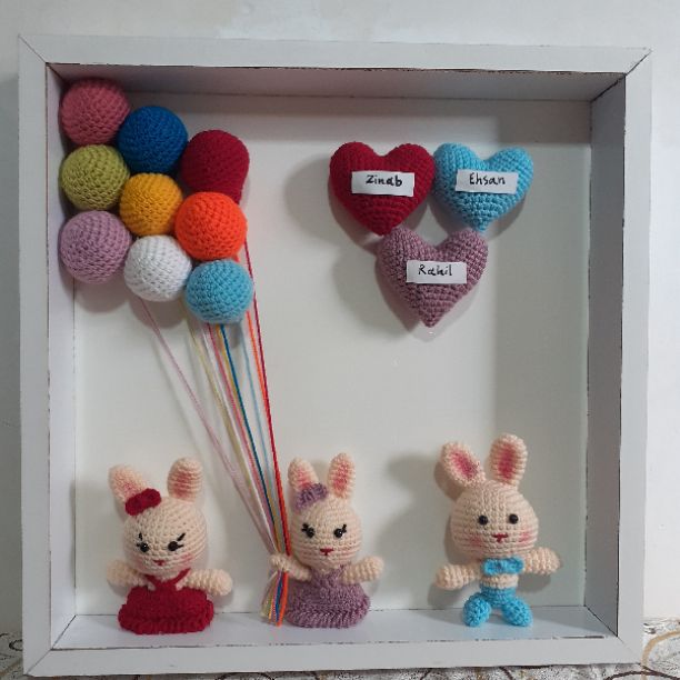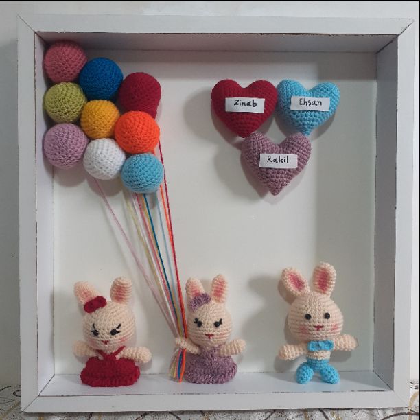 تابلوی لاکچری خرگوش،خیلی زیبا،شیک،باکلاس،محتویات داخل دست بافت،خیلی زیبا برای تزیین اتاق،بادوام،تابلویی خانوادگی که تعداد خرگوش ها متناسب با تعداد اعضای خانواده است.روی قلب ها نیزاسم های والدین وبم ها نوشته میشود