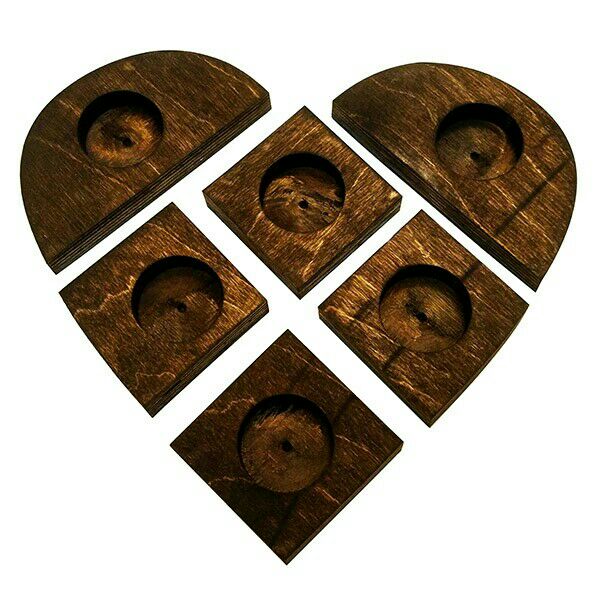 جاشمعی طرح قلب از یک مجموعه ۶ عددی تشکیل شده است تشکیل شده و در سه رنگ قهوه ای تیره ، قهوهای روشن و خودرنگ چوب عرضه میشود شما میتوانید این محصول را به صورت جدا و مجموعه استفاده کنید و در پوزیشن های مختلف چیدمان کنید