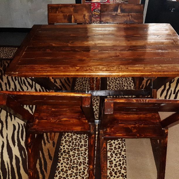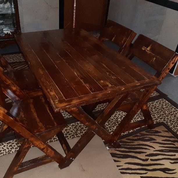 چهار صندلی با میز حدودا یک متر و۲۰ سانت استفاده از سلر و کلر و جلا برای زیبایی و ماندگاری چوب استفاده از پیچ های بلند ۱۵ سانتی برای وصل کردن انها و...