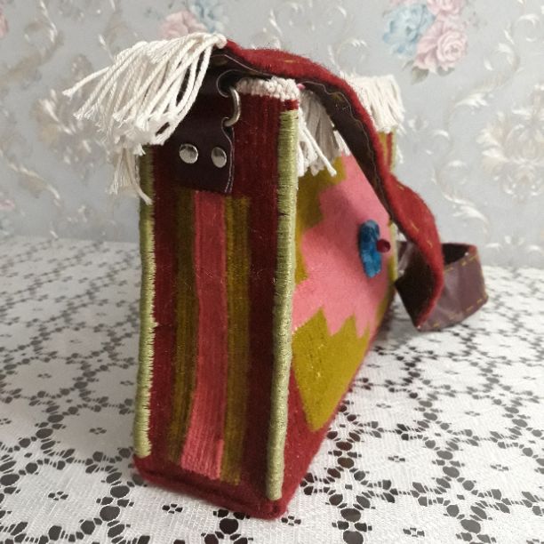 این کیف روصفر تا صد کار خودمه. یعنی گلیم رو بافتم قطعات رو بهم وصل کردم داخل کیف آستر گذاشتم و دارای چندتا جیبه و درب کیف زیپ داره
