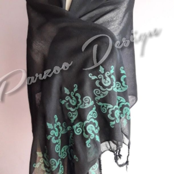 نقاشی گل شاه عباسی بر روی شال نخی\nاجرای طرح به صورت کاملا دستی و با رنگ مخصوص پارچه انجام شده است. رنگ ها کاملا بر روی پارچه تثبیت شده و قابل شست و شو است.\nبا دست، صابون مایع و آب ولرم شسته شود\nبنا به سفارش شما این طرح بر روی رنگبندی متنوع قابل اجرا است.