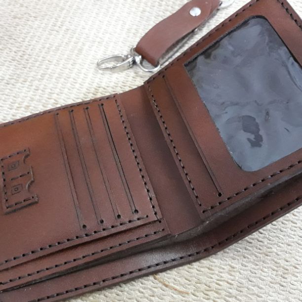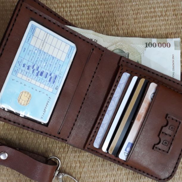 کیف پول چرم کاملا دستدوز و تهیه شده از چرم مرغوب دارای جای پول و جای کارت و مدارک و جای عکس وجای سیم کارت و رم قابل سفارش دررنگ دلخواه سایز ۱۲در۲۱/۵