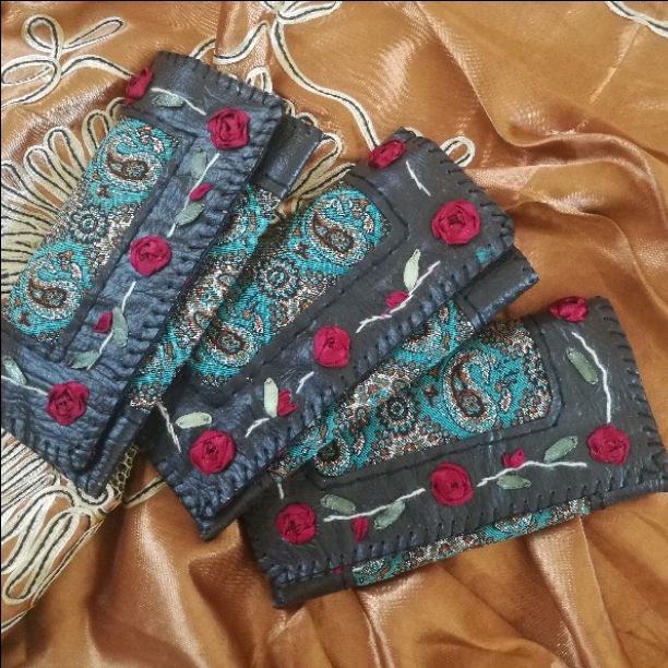 کیف چرم دست دوز ترکیب چرم و پارچه دارای جای عکس و کارت بانکی و گوشی سه لت آماده تحویل