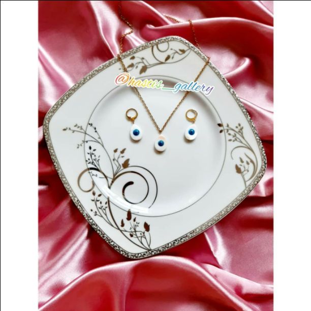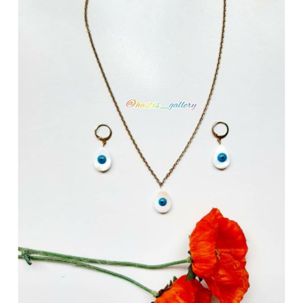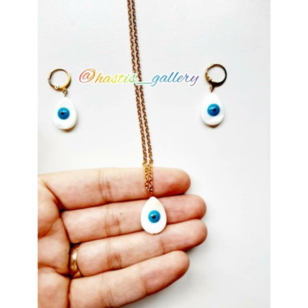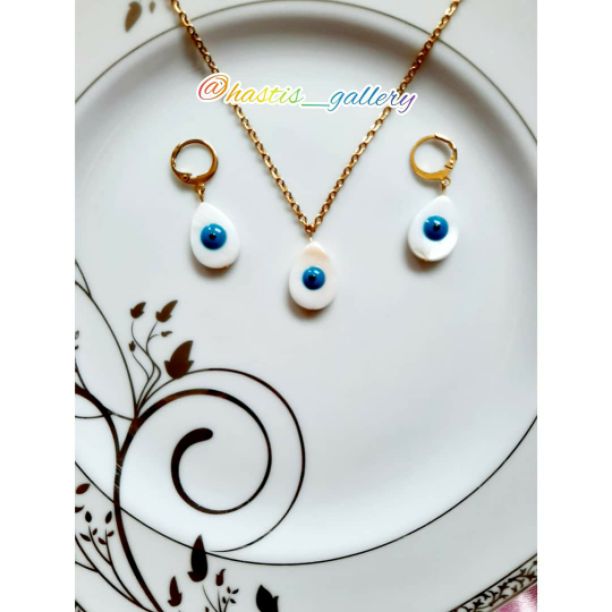 نیم ست استیل رنگ ثابت با صدف چشم زخم قطره ایی .شامل گردنبند و گوشواره بسیار شیک و زیبا