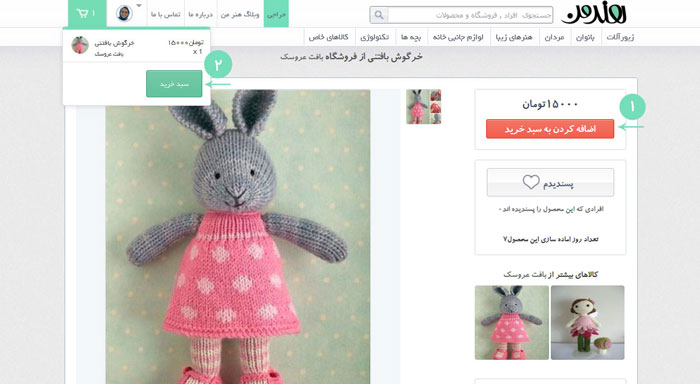 پس از انتخاب کالا و ورود به صفحه جزئیات محصول با زدن دکمه اضافه کردن به سبد خرید و سپس کلیک بر روی سبد کالا در (مرحله 2 که در تصویر نمایش داده شده است) کالا به سبد خرید شما اضافه می شود .