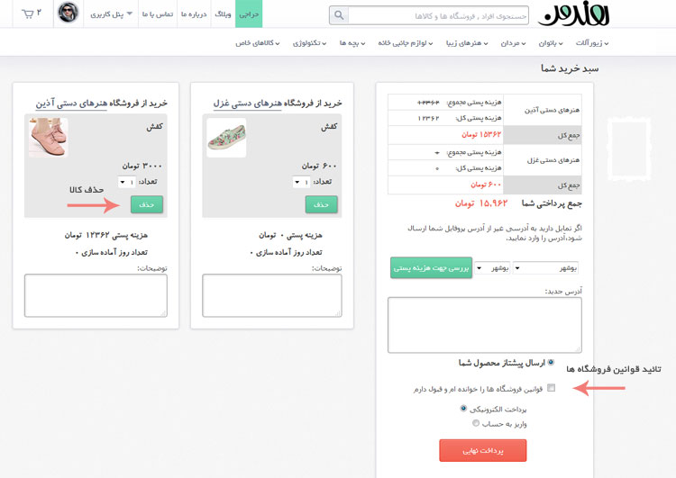نکته:در صفحه سبد خرید قبل از نهایی کردن خرید می توانید کالا را مطابق شکل زیر از سبد خرید خود حذف نمائید.