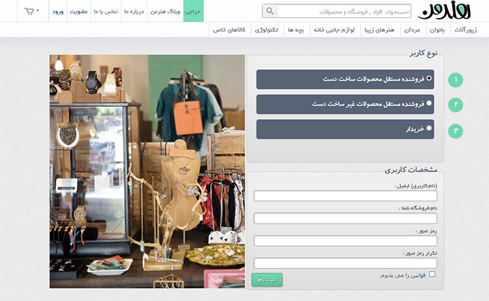 2.انتخاب نوع کاربری،اگر قصد فروش محصولات ساخت دست خود را دارید گزینه اول،اگر قصد فروش محصولات نو دارید(محصولاتی که در قوانین محصولات قابل فروش ذکر شده است)گزینه دوم و اگر به عنوان خریدار قصد خرید محصول از سایت هنر من را دارید گزینه سوم را انتخاب نمایید.