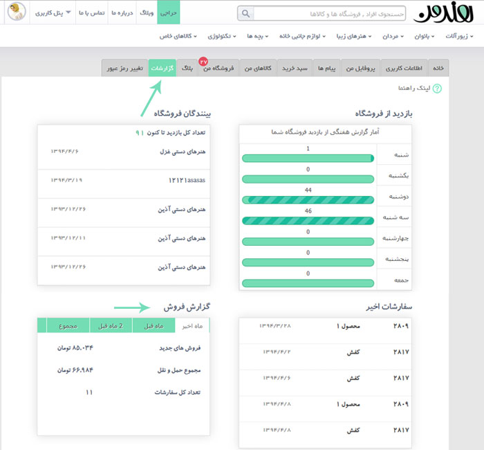 برای مشاهده آمار و گزارشات فروش خود و همچنین افرادی که از فروشگاه شما بازدید نموده اند و نیز گزارش هفتگی از بازدید فروشگاه شما میتوانید با مراجعه به پنل خود و زبانه گزارشات،گزارش فروش خود را به صورت زیر به همراه مبلغ کل فروش در هفته،ماه و در مجموع به همراه تعداد کل سفارشات مشاهده نمایید.